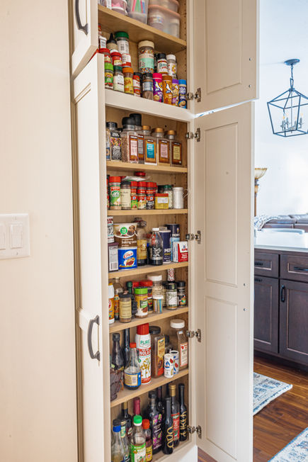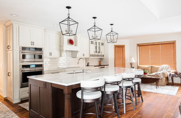 In this remodel, we removed a wall that was separating the kitchen and great room, allowing to incorporate this large island! A custom hood, lots of unique storage solutions and a wine bar made this a huge transformation for these clients!